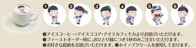 期間中、「おそ松さん」をイメージしたオリジナルフードやデザート、コラボドリンクなどが楽しめます。また、描き下ろしイラストを使用した店内装飾や、同フロアに併設のアイテムショップでは限定のオリジナルグッズも多数登場予定です。