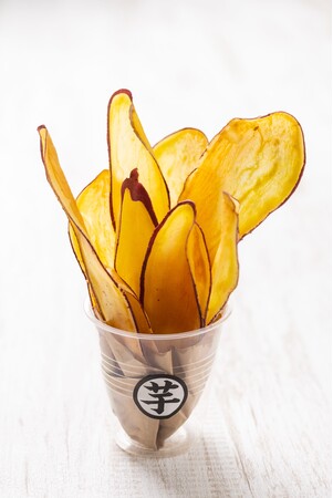 縦に薄くスライスした紅はるかをパリッと軽く揚げました。優しい甘さをご堪能ください。