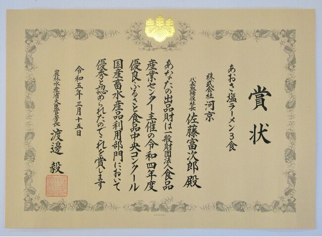 株式会社河京(本社:福島県喜多方市、代表取締役:佐藤富次郎)の「あおさ塩ラーメン3食入り」が、令和4年度優良ふるさと食品中央コンクールにて「農林水産大臣官房長賞」を受賞しました。本商品は観光土産商品卸しのアイビー株式会社(本社:宮城県仙台市、代表取締役:山本拓也)からの企画提案を受け福島県相馬松川浦産のあおさを使用した「あおさ塩ラーメン3食入り」を共同開発。2022年4月1日(金)より発売しました。