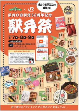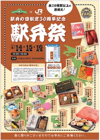 西日本旅客鉄道株式会社中国統括本部(広島市東区上大須賀町15-20、執行役員中国統括本部長:藏原 潮)広島駅弁当株式会社(本社:広島県広島市東区矢賀5-1-2、代表取締役社長:中島 和雄)は、4月10日に駅弁の日制定30年を迎えることから、広島駅(広島県広島市南区松原町2-37)と新山口駅(山口県山口市小郡令和1-2-1)において、駅弁祭を開催します。 今回の駅弁祭りでは、中国地方を中心とした全国各地の駅弁をご用意するだけでなく、鉄道食文化や駅弁の歴史について会場でパネル展示を行います。また、中国エリアを走る観光列車等のPRコーナーも設置します。ぜひ、駅弁祭りにお越しいただき、鉄道の食文化に触れていただき、旅と食をお楽しみください。※駅弁祭の開催は、広島駅では3回目、新山口駅では初めてとなります。