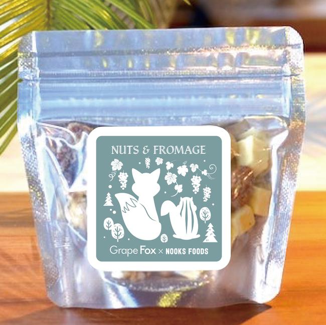 東京の代々木上原に本店を構え、オーガニックを中心とした自然食材を使用しながらひとつひとつの美味しさにこだわる、オリジナルフレーバーナッツ&グラノーラの専門店<NOOKS FOODS(ヌークスフーズ)>。NOOKS FOODSとGrapeFoxがともに掲げるのは「大切な人へのギフト」。今回のポップアップショップ限定パッケージには、NOOKS FOODSのキャラクターのリスと、キツネの吉が仲良くナッツを食べてる後ろ姿が愛らしく、ギフトやお土産にぴったりです。保存に適したジップ付きのパッケージもうれしいポイント。ギフトにはもちろん、ポップアップショップ内で、GrapeFoxのワインと一緒にお楽しみいただけます。