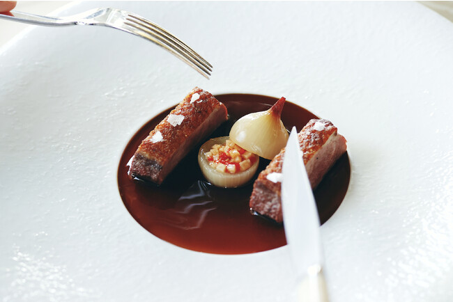 ジュニパーベリーやハーブで 3~4 日マリネし、絶妙な火 入れで仕上げた鴨。皮目はパリッと香ばしい食感です。 鴨の旨味に黒ニンニクを合わせた深みのある濃厚なソー スでお召し上がりいただきます。中央にあるペコロスに はカルミネシェフからのサプライズが。カットされたペ コロスの中には、さいの目にカットしたじゃがいものフリットと、ローストしたパプリカが、カラフルに詰められています。細部まで料理人の手仕事を施した一皿です。