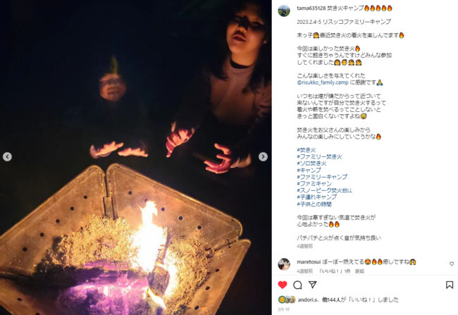 いつもは、こどもたちがすぐに焚火に飽きてしまって、1人で焚火するパパ。今回こどもたちは落ちている枝を焚火にくべるのが楽しくて、はじめて家族で焚火を囲めたそう。