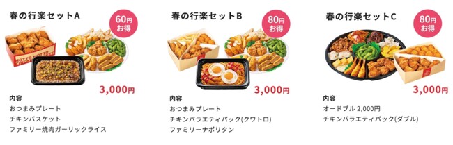 ご家族やご友人とのおでかけが増える春のシーズンに合わせ、おでかけに役立つ情報やお得な情報をお届けする「ほっともっと春の行楽特集」特設サイトを期間限定で公開中です。本サイトからのみご予約いただける、『パーティプレート』やファミリーメニューをセットにしたちょっとお得な「春の行楽セット」を3種類ご用意しました。さらに、人気の『チキンンバスケット』は、数量限定で春気分を盛り上げるピンクの桜パッケージで登場します。お好みのお弁当と合わせて、ぜひご注文ください。