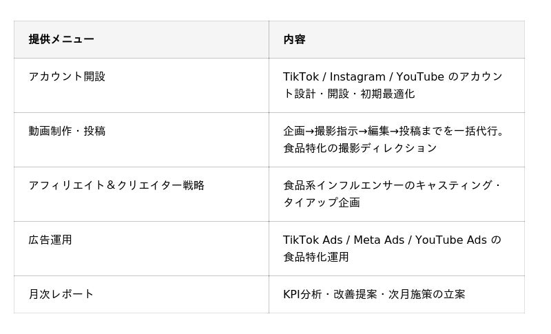 「動画を24時間働く販売員に変える」をコンセプトに、アカウント開設から動画制作・投稿、クリエイター戦略、広告運用までを一気通貫で支援。1億本超のSNS動画データを常時分析し、食品カテゴリのトレンドを先読みしたコンテンツ企画で、クライアントの売上に直結する運用を実現します。
