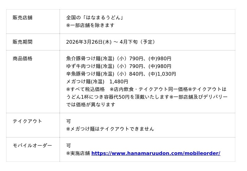 讃岐うどんチェーン「はなまるうどん」を展開する株式会社はなまる(本社:香川県高松市 代表取締役社長:前田良博、以下はなまる)は、2026年3月26日(木)より、全国(※一部店舗除く)のはなまるうどんにて、「魚介豚骨つけ麺」「ゆず牛肉つけ麺」「辛魚豚骨つけ麺」の3種と、規格外のボリュームを誇る「メガつけ麺」を期間限定で新発売いたします。
