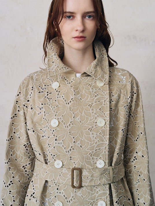 刺繍、素材、パーツを緻密に組み合わせたディテールから生まれる陰影と立体が特徴の表情豊かなエンブロイダリートレンチコート。