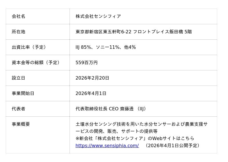 株式会社インターネットイニシアティブ(以下IIJ)は、ソニーセミコンダクタソリューションズ株式会社(以下ソニー)とともに、スマート農業向けに土壌水分センサーおよび灌水(かんすい)ナビゲーションサービスを提供する合弁会社「株式会社センシフィア(以下センシフィア)」を設立したことをお知らせいたします。センシフィアは、2026年4月1日から事業を開始します。