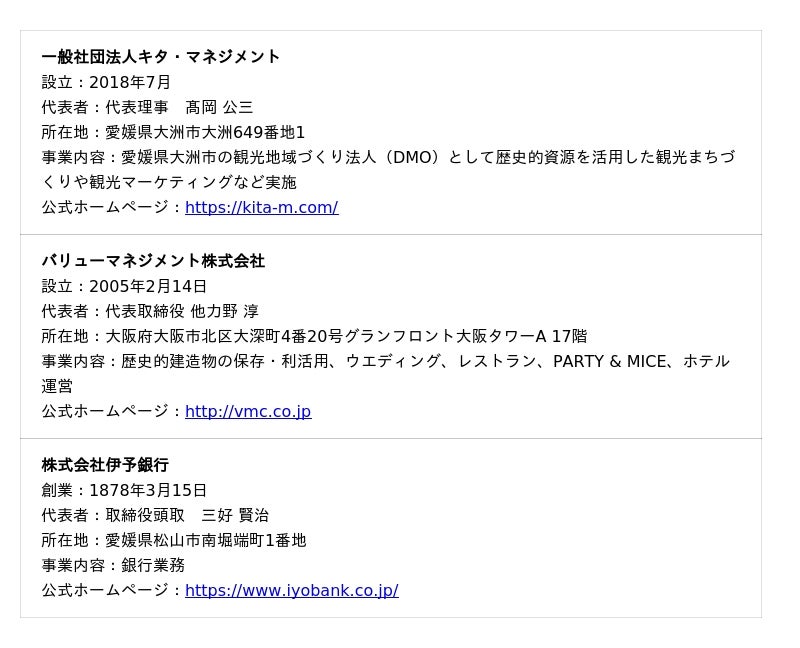 バリューマネジメント株式会社(所在地:大阪府大阪市、代表取締役:他力野 淳、以下、VM)は、愛媛県大洲市の地域DMOである一般社団法人キタ・マネジメント(所在地:愛媛県大洲市、代表理事:高岡 公三 以下、キタM)、株式会社伊予銀行(所在地:愛媛県松山市、取締役頭取:三好 賢治 以下、伊予銀行)と協働で、愛媛県大洲市を対象にした?次世代の地方都市まちづくりビジョン”「おおず未来のまちづくり構想」を策定いたしました。本件にもとづく具体的なアクション「OZU 555 PROJECT」(以下、本プロジェクト)を3者合同で始動いたしますのでお知らせします。