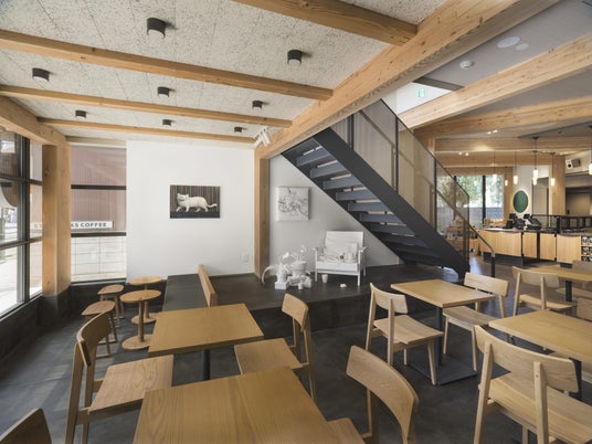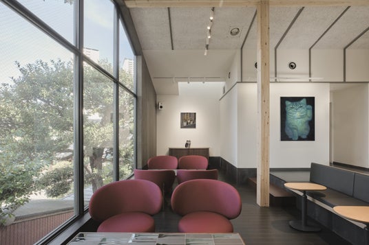 店内中央の階段をあがると、2階には4つのエリアを設けており、24点の作品とともに、好きな席で思い思いの時間を過ごしていただけます。1つ目は中2階のカウンター席で、街並みを眺めながらコーヒーが楽しめる席を用意。2つ目は、フロア中央のエリアで大きなコミュニティテーブルを配置し、作品を間近にご覧いただける特等席です。3つ目と4つ目は、北側と西側の、わずかに床面が下がったエリア。この敷地の特長でもあるお寺の境内に面した店舗のつくりをよりダイナミックに体験いただけるよう、境内の伽藍や植栽を借景とさせていただく大きな窓を設えました。お寺の豊かなみどりと静寂さを感じる北側ではソファ席に座り、自然を感じながらアートをご覧いただけます。西側には、ソファ席、テーブル席、小上がりの席をつくり、お子様連れやご家族でもゆっくりと過ごして頂けます。時間帯や、座る席によって同じアートも見え方が異なり、谷中の街を散策するようにお客様自身でお気に入りの作品と客席を見つけていただけます。