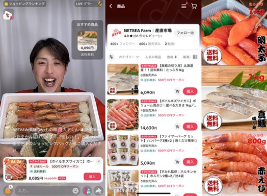 今回、本ズワイガニや真鱈、明太子、赤えび、人気のご当地グルメなどの商品を追加いたしました。TikTok Shop「産直市場」でのライブ配信を通して、ライバーが実際に商品を紹介しながら、その魅力やおすすめの食べ方などをリアルタイムで発信しています。