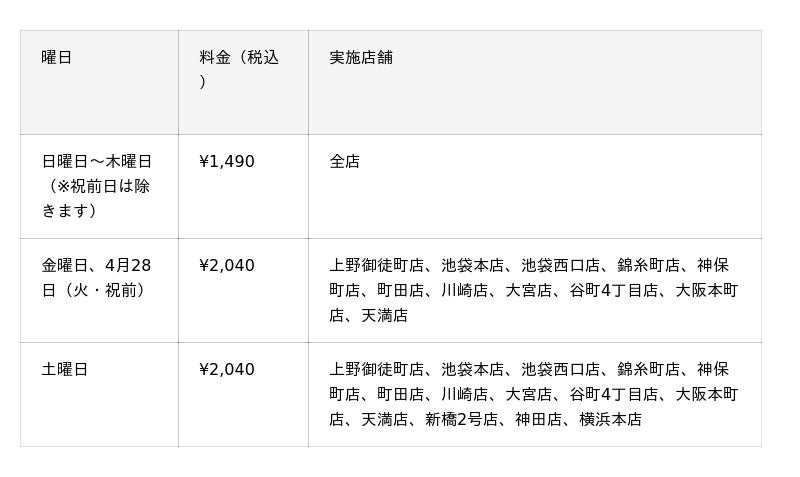・上野御徒町店、池袋本店、池袋西口店、錦糸町店、神保町店、町田店、川崎店、大宮店、谷町4丁目店、大阪本町店、天満店は¥1,930(税込)で金曜、土曜、祝前日も開催します