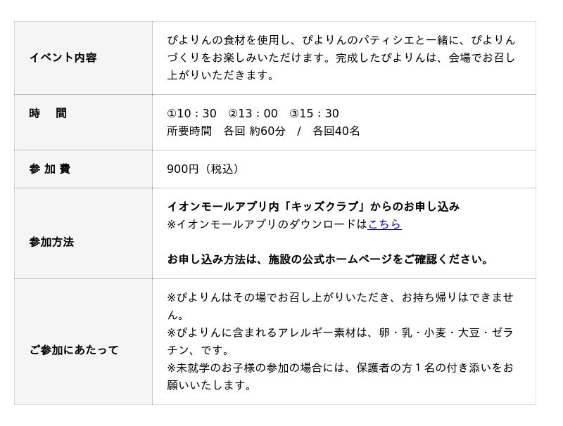 ジェイアール東海フードサービス株式会社(本社:愛知県名古屋市、代表取締役社長:岩下賢一)が展開するオリジナルスイーツ「ぴよりん」の手づくり体験ができるワークショップを、2026年4月14日(火)・15日(水)の二日間、「イオンモール各務原インター」にて開催いたします。本イベントでは、ぴよりんの製造工程の一部を体験しながら、自分だけのぴよりんを手づくりで仕上げていただけます。完成後は、その場でできたてをお召し上がりいただけます。普段はなかなか見ることのできない“ものづくりの楽しさ”を体感できる、体験型ワークショップです。