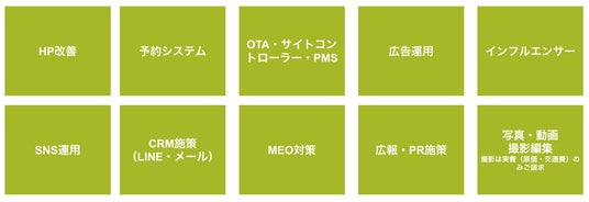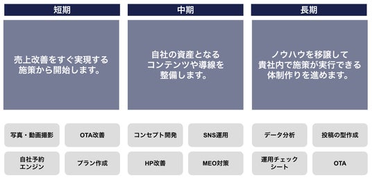 - 販売チャネルの最適化(OTA・自社サイト改善)構築した戦略に基づき、写真・動画撮影から具体的なプロモーション施策、プラン販売までを展開。公式サイトの改善アドバイスに加え、MEO対策など、場当たり的でない戦略的なチャネル運用を実現します。