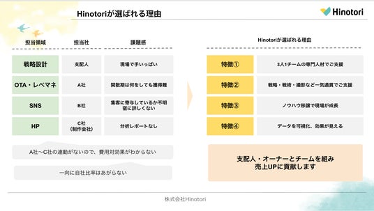 地域観光と宿泊施設のマーケティング支援を行う株式会社Hinotori(本社:東京都渋谷区、代表取締役社長:大崎庸平)は、価格競争やOTA依存から脱却し、自社予約を最大化する「宿泊施設向け総合マーケティング支援」を強化いたします。