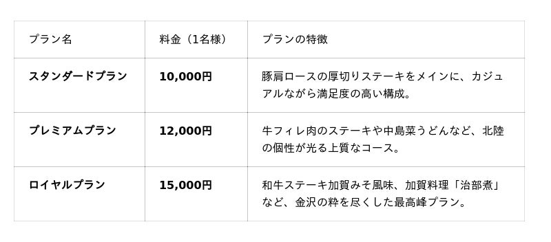 ロイヤルプラン: 前菜盛り合わせ、近江町市場より鮮魚のお造り、鮮魚と海老のポワレ サフランソース、加賀料理 能登しいたけと鴨の治部煮、和牛ステーキ 加賀みそ風味、手毬寿司、お吸い物、デザート(3品)、コーヒー