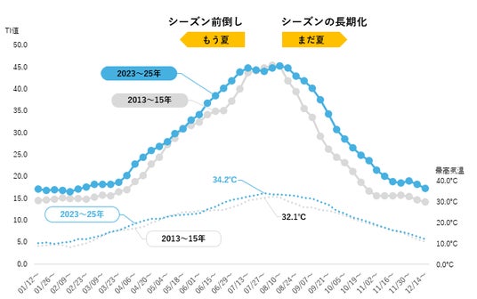 一方、8月上旬のピーク値には大きな変化はみられません。つまりアイスの需要は、ピークが高くなったのではなく、前後に6週間ほど広がりシーズンが長期化している様子です。