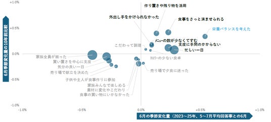【図3】は、夕食献立作りの意識や出来事に関する毎夕食アンケートの回答率を用いて、6月の季節変量(横軸)と、その10年前比較(縦軸)をプロットしたものです。気持ちの面でも6月は簡便意識が上昇していること、加えて栄養バランス意識も上昇していることが分かります。