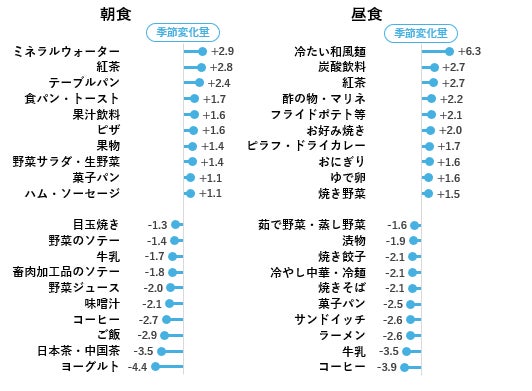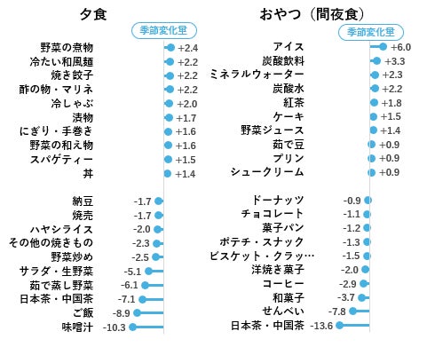 【図2】ではメニューTI値の6月季節変化量を10年前と比較し、上昇したメニューと低下したメニューそれぞれ10位を示しました。朝食では、ご飯食からパン食へのシフトや果汁や果物の上昇、朝の水分補給でしょうかミネラルウォーターも上昇しています。昼食はそうめんや冷たい蕎麦/うどんなどの和風麺。夕食では冷たい和風麺や冷しゃぶ、酢の物などの涼味。パスタや丼など簡便メニュー、スタミナメニューの餃子なども上昇していました。6月の食卓は、さっぱりメニューの前倒しや簡便食など、だいぶ夏仕様に変わっているようです。