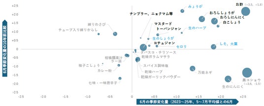 ここまで涼味や簡便、栄養バランスなど、6月に増加している生活者ニーズをご紹介してきましたが、さらに、食事の味付けや風味付けにも新しい兆しが見られます。【図4】は6月の夕食で使われた香辛料・ハーブ類のTI値季節変化量を示したものです。5~7月の中で6月にTI値が増える食材が右側に、その変化量が10年前より上昇しているものが上側にプロットされています。薬味としてよく使われる生姜、みょうが、しそのほか、最近では生のハーブやセロリ、ナンプラー、コチュジャン、トーバンジャンといったエスニック食材も上昇していることが分かりました。