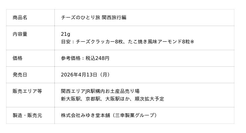 三幸製菓グループの株式会社みゆき堂本舗(所在地:新潟市北区)は、2026年4月13日(月)より、関西エリアJR駅構内お土産品売り場限定で「チーズのひとり旅 関西旅行編」(21g・248円税込)を発売いたします。