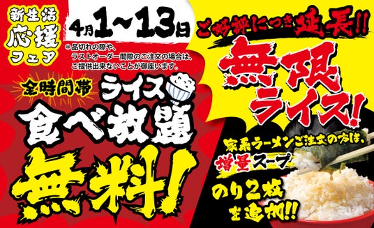株式会社ガーデン(本社:東京都新宿区 代表取締役社長:川島賢 以下「当社」)が運営する「壱角家」は、コメ価格の下落に伴い、横浜家系ラーメンとライスの至福の組み合わせ「家系めし」を、より多くの皆様に楽しんでいただくために開催している「壱角家【無限ライス】キャンペーン」について、好評につき、4月13日(月)までライス食べ放題無料の期間を延長し、「壱角家【無限ライス】新生活応援フェア」を開催します。