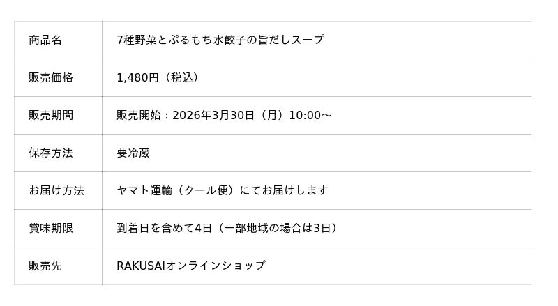 d130004-132-cf5ee115513b41d3cdcfaed917b2dcc1.pdf 楽彩株式会社(本社:東京都足立区、代表取締役社長:大崎善保)は、厳選したカット済み野菜の鮮度と手軽さで支持されるミールキットブランド「RAKUSAI」より、新メニュー『7種野菜とぷるもち水餃子の旨だしスープ』を2026年3月30日(月)に発売いたします。鶏ガラ・白だし・トマトだし・野菜だし「4種のだし」を贅沢に重ねることで、7種の野菜の旨みを最大限に引き出しました。ぷるもち食感の水餃子と、澄んだスープが奏でるやさしい喉越し。環境の変化が多い春、最後の一口まで飲み干したくなる「旨だし」の魔法が、頑張るあなたの夕食時間を癒やしのひとときへと変えます。一杯で心もお腹も満たされる、贅沢な「食べるスープ」の誕生です。