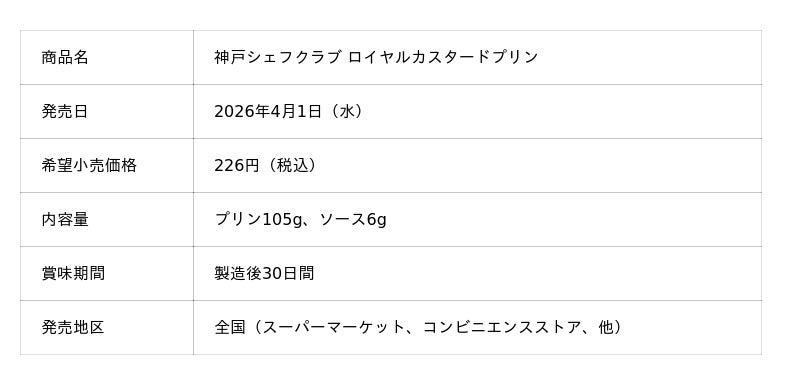 トーラク株式会社(本社:兵庫県神戸市東灘区向洋町西5丁目5番、代表取締役社長:毛利 功一郎)は、「神戸シェフクラブ ロイヤルカスタードプリン」を2026年4月1日(水)から発売いたします。