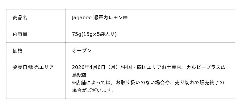 カルビー株式会社(本社:東京都千代田区、代表取締役社長兼CEO:江原 信)は、じゃがいもの味わいと独自の食感が楽しめる「Jagabee」から、ご当地「Jagabee」の新たなラインアップとして2つのフレーバーを発売します。お土産品として『Jagabee 瀬戸内レモン味』を2026年4月6日(月)から発売するほか、沖縄エリアのお土産品として『Jagabee 旨辛島とうがらし味 』を2026年4月6日(月)から発売します。