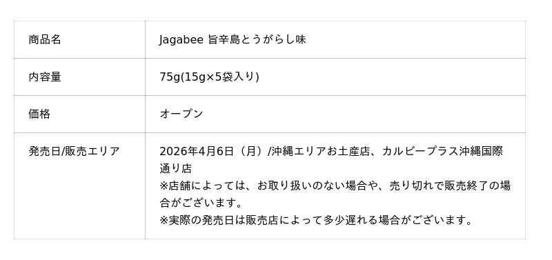 ※『Jagabee 旨辛島とうがらし味』は沖縄県産島とうがらしを島とうがらしパウダーとして0.03%使用しています。