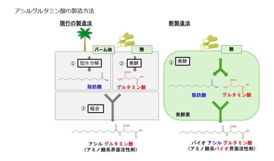 味の素株式会社(社長:中村 茂雄 本社:東京都中央区)は、従来パーム油由来の脂肪酸を原料とするアミノ酸系界面活性剤の製造において、世界各地で安定的に調達可能な糖のみを原料とする、発酵技術を用いた新製法を開発しました(特許出願中)。本技術により、石油由来原料のみならず、パーム油も使用しないアミノ酸系バイオ界面活性剤(微生物が作る界面活性剤)の提供が可能となります。この技術を活用することで、従来のバイオ界面活性剤で課題とされていた色やにおいの問題を解決し、より高い泡立ちを実現しました。当社は持続可能な原料の活用による、環境に配慮した製造技術を通じて高機能な素材の開発を推進し、今後も肌にやさしく、心地よい製品を生活者に提供していきます。