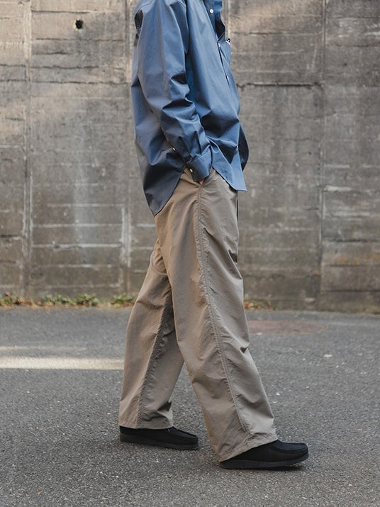 新作のNYLON WIDE PANTは、軽量で撥水性に優れたナイロン素材を採用し、機能性とファッション性を兼ね備えた新作トラックパンツ。