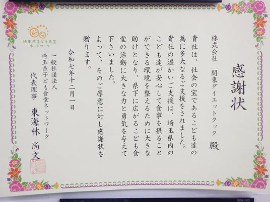 提供を始めてからは、彩りが良い、野菜が摂取できて嬉しいと喜びの声をいただき、2025年12月に、埼玉県子ども食堂ネットワーク様より感謝状をいただきました。また、各団体や子どもたちから感謝の手紙をいただいています。