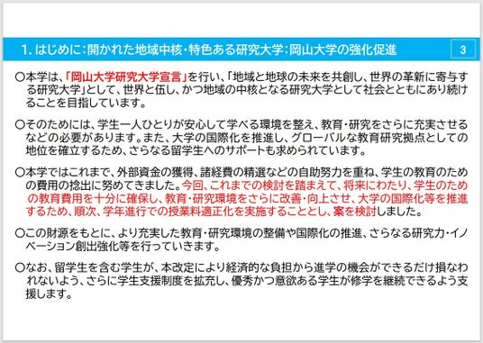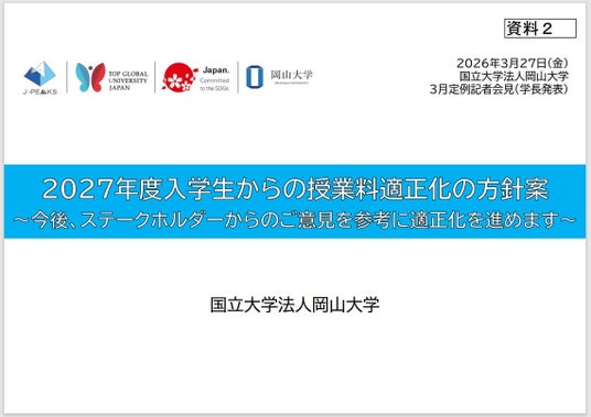 国立大学法人岡山大学(本部:岡山市北区、学長:那須保友)は、2026年3月27日の定例記者発表(学長発表)において、学内の法定会議等を経て取りまとめた「2027年度入学生からの授業料適正化の方針案~今後、ステークホルダーからのご意見を参考に適正化を進めます~」を公開しました。