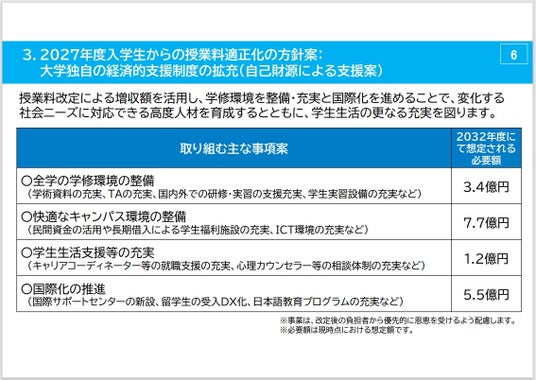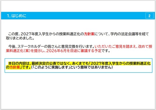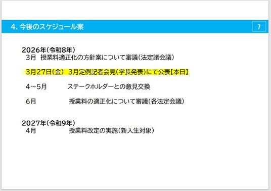 今後、ステークホルダーの皆さんと意見交換を行い、いただいたご意見を踏まえ、改めて授業料適正化(案)を提示し、審議する予定です(本日の内容は、最終決定の公表ではなく、あくまでも「2027年度入学生からの授業料適正化の方針案」です)。