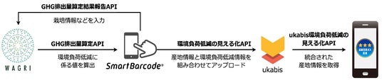 SmartBarcode(スマートバーコード)(注.1)をつかって栽培情報などを入力することで、農業データ連携基盤「WAGRI(ワグリ)」(注.2)の環境負荷低減の見える化システム(GHG(温室効果ガス)排出量算定API)(注.3)によって削減貢献値を算出。