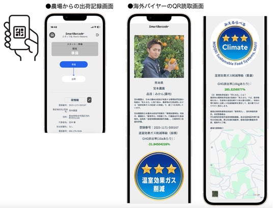 実証では、環境負荷低減の情報を取得できるQRコードを青果物の箱に添付し、輸出先のバイヤーがスマートフォンなどで確認できる仕組みを構築した。台湾向け輸出では、温州みかんの出荷にこの仕組みを適用した。これらによって、輸出先における商品の信頼性や付加価値の向上につながった。