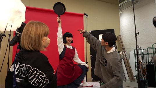 撮影当日、いつもの制服姿に、エプロンを着用した可愛らしい姿で現場に登場したアバンギャルディの16名。グラフィック撮影から1日の撮影がスタートしました。片手でフライパンを持ち上げるシーンなど重たいものを持ち上げる撮影もありましたが、さすがの体感でブレることなく完璧な撮影でした。