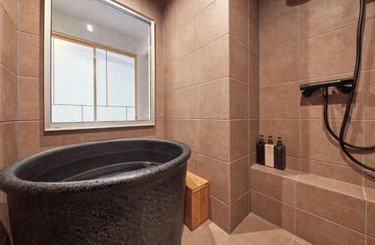 開放的な浴室には「壺風呂」があり、信楽焼を使用した陶器製の浴槽はリラックスした入浴体験を提供します。陶器からあふれるお湯と共に日頃の疲れやストレスを流し、爽快感を味わえるお風呂です。
