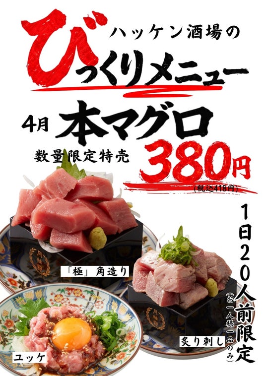 「人・おいしさ・楽しさ」をモットーに地元密着型の居酒屋チェーンを展開するマルシェ株式会社(本社:大阪市阿倍野区、代表取締役社長:加藤 洋嗣)は、「ハッケン酒場」直営13店舗にて2026年4月限定で「びっくりメニュー」として本マグロを特別価格で提供いたします。
