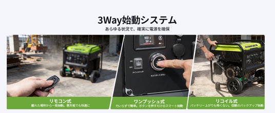 GT8000iOTEは、リコイル始動、ワンプッシュ始動、リモコン始動の3種類に対応しています。使用シーンに応じた柔軟な操作が可能です。