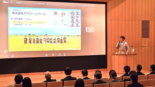 青森県黒石市で、米、大豆の有機農業を59ヘクタールで実践するアグリーンハート代表の佐藤拓郎さんは、「有機農業で拓く持続可能な未来~省力化・生産性向上、そして地域共生へ」と題して記念講演。播種を遅くして、雑草を抑える大豆栽培など環境負荷低減と省力化に向けた実践内容を紹介しました。