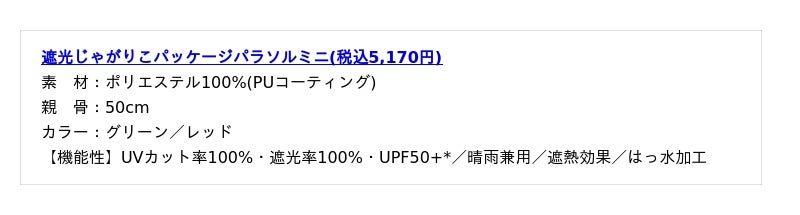 ※記載の結果は生地の状態での測定値であり、傘本体の性能を示す数値ではございません。また、生地に施された刺繍・縫製などのUV加工生地以外の部分もこの限りではございません。