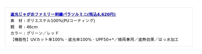 本物そっくりの傘ケースはインパクト大!ケースの中には普段使いしやすいパステルカラーの日傘が入っており、グリーンには父・じゃがお、レッドには母・りかこのイラストがワンポイントでプリントされています。ケース裏にはじゃがりこおなじみのダジャレを入れたり、傘の組成やサイズなどをじゃがりこのパッケージ風に表記する遊び心も。