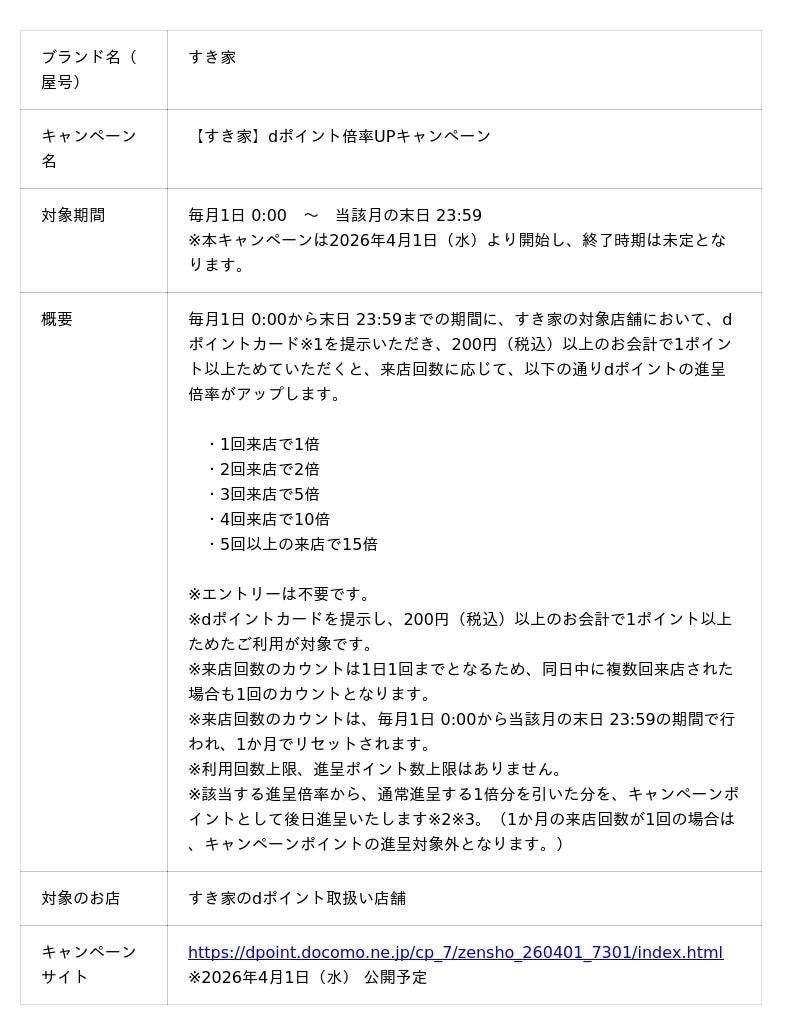 本キャンペーンの参加にはエントリーは不要です。毎月1日から当該月の末日までの期間に、すき家の対象店舗でdポイントカード※1を提示いただき、200円(税込)以上のお会計で1ポイント以上ためていただくと、来店回数に応じて、dポイントの進呈倍率がアップします。詳細はキャンペーンサイトをご確認ください。