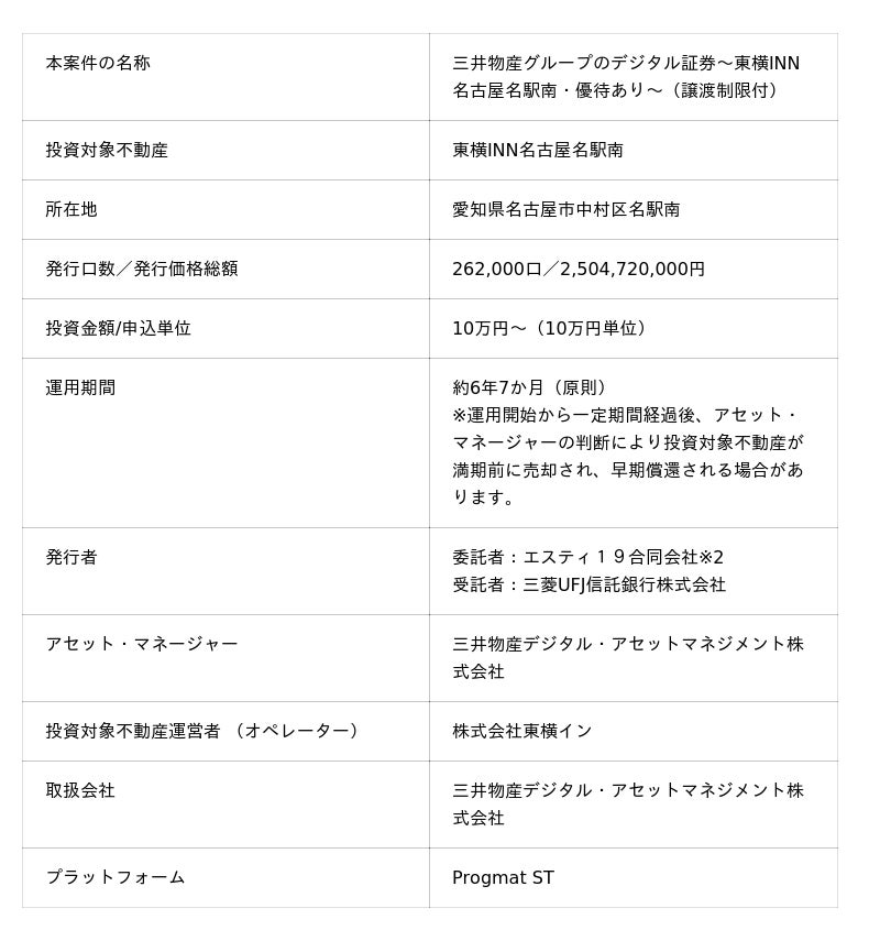 株式会社東横イン(代表執行役社長:黒田(くろだ) 麻衣子(まいこ)、以下「東横イン」)、三井物産デジタル・アセットマネジメント株式会社( 代表取締役社長:上野(うえの) 貴司(たかし)、以下「MDM」)及び三菱UFJ信託銀行株式会社(取締役社長:窪田(くぼた) 博(ひろし)、以下「三菱UFJ信託銀行」)の3社は、東横インが運営するホテル「東横INN名古屋名駅南」(以下「投資対象不動産」)を裏付け資産とした受益証券発行信託スキームを活用した不動産セキュリティ・トークン(以下「本案件」)の公募において協業し、このたび募集・発行を完了いたしました。本件は、投資対象不動産を活用した新たな資金調達とセキュリティ・トークンの発行を通じた東横インファンの拡大を図るべく、効果的なマーケティングについて3社間で協議を重ねたことにより実現したものです。