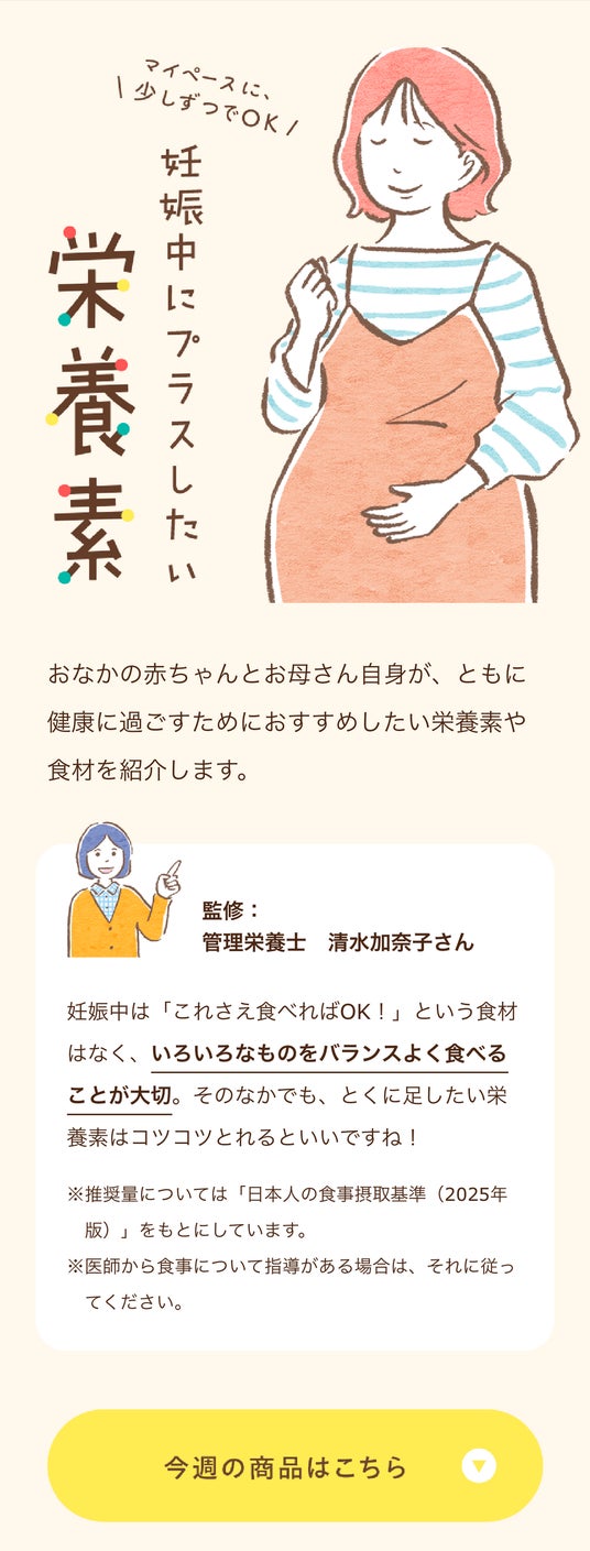 管理栄養士の清水加奈子さんが監修し、妊娠中の摂取が推奨される「鉄分」「葉酸」「たんぱく質」を、日々の食事で無理なく補える商品を紹介します。栄養素の重要性を解説し、納得感のある商品選びをサポートします。