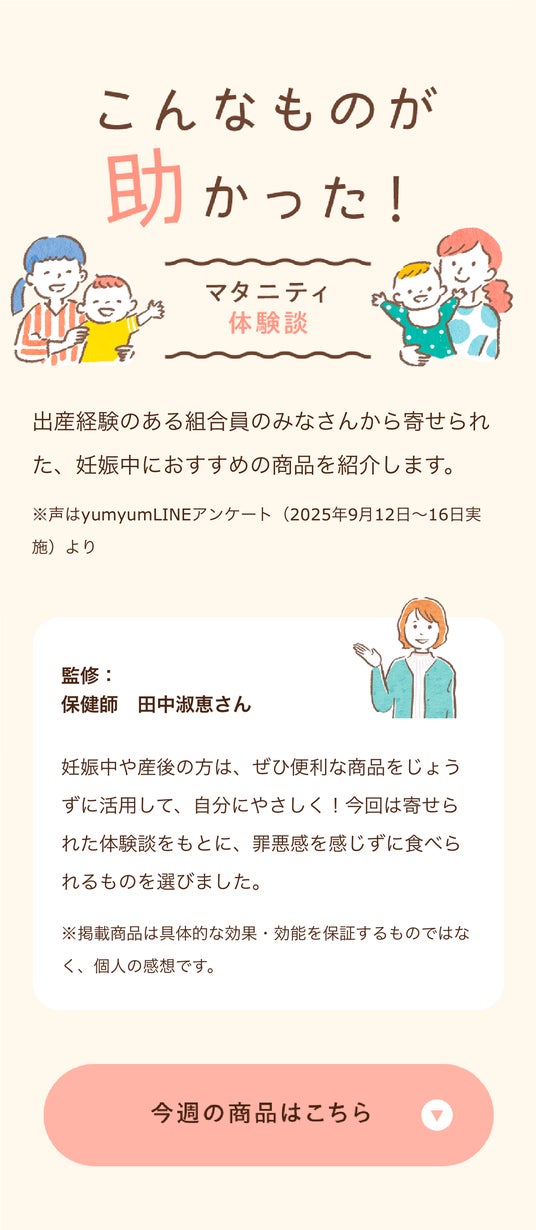 利用者アンケートから、つわり中に食べやすかった商品や、産後の疲労時に重宝した「お助けアイテム」を体験談とともに紹介します。保健師の田中淑恵さんからの心と体をいたわるメッセージを添え、孤独を感じやすい時期の不安に寄り添います。