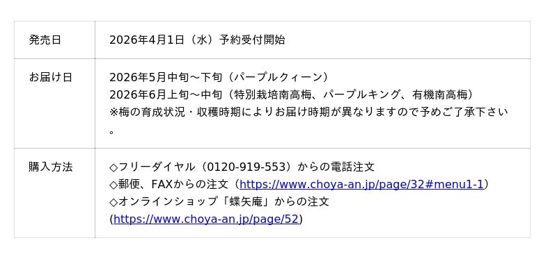 梅酒と梅シロップ作りに適した4種類の梅は、梅酒メーカーとして日本で一番梅を調達しているチョーヤだからこそお届けできる希少な梅ばかりです。数に限りがございますので、お早めのご予約をどうぞ。