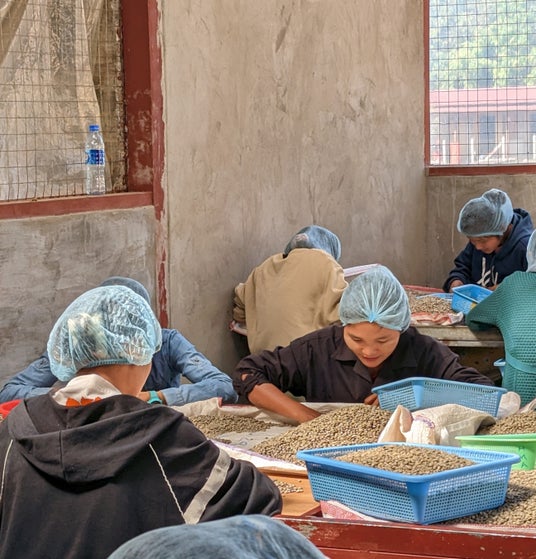 ユワンガンにあるアマヤーコーヒーの生豆選別作業所では地元の若い女性たちがたくさん働いています。